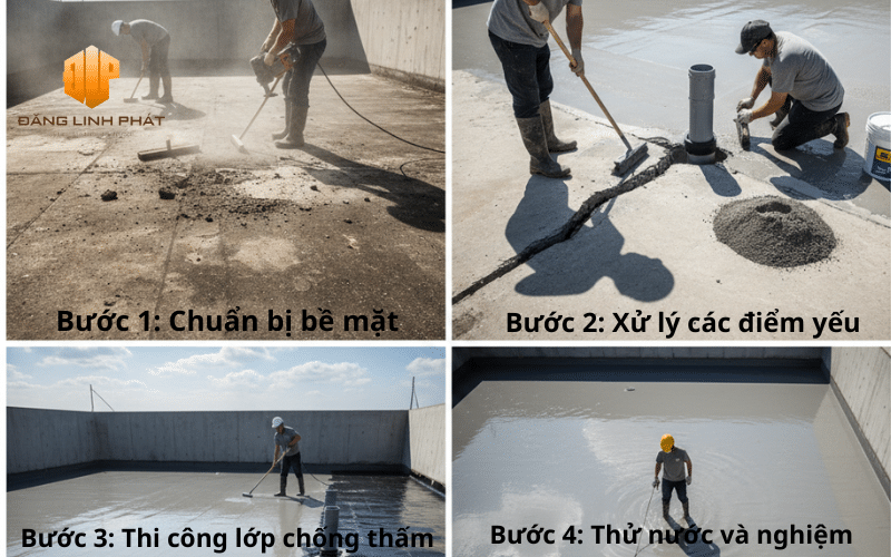 Quy trình chống thấm sân thượng tại Dĩ An gồm vệ sinh bề mặt, xử lý khe nứt và thi công lớp chống thấm