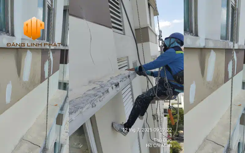 Thợ đu dây xử lý chống thấm tường nhà cao tầng ngoài trời tại TP.HCM