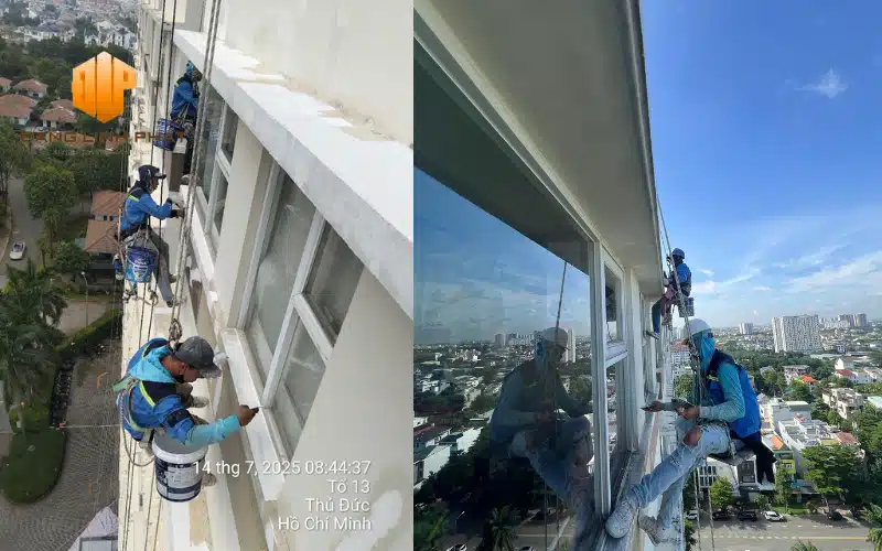 Thợ đang đu dây thi công chống thấm tường ngoài trời tại TP.HCM