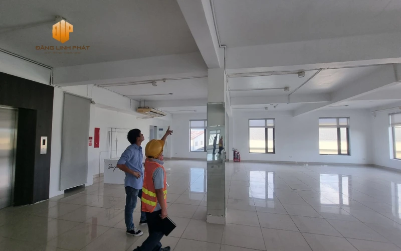 Kỹ thuật viên đang khảo sát công trình văn phòng tại Tân Uyên để thi công vách thạch cao.