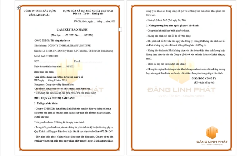 Mẫu giấy cam kết bảo hành dài hạn cho khách hàng thi công vách thạch cao.